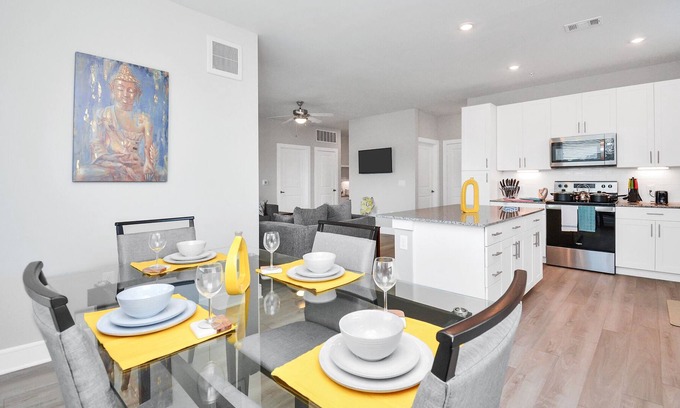 Clean Modern, Family and pet friendly place w/luxurious amenities. This spacious 2 bed 2 bath unit is great for Relaxing during a family and Friends getaway, enjoy a beautiful balcony over looking the swimming pool & club house area. Our unit is fully furnished & equipped with all the items to make your families get that comfortable home feeling. Our kitchen is equipped with new stainless steel appliances, dishwasher, in-unit washer/ dryer, bathroom with a large tub & double perfect for relaxing.