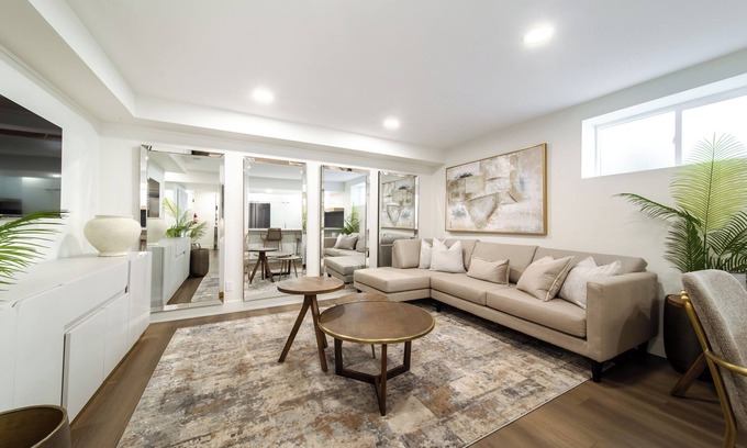 This spacious, luxury home offers a comfortable retreat with central air conditioning, perfect for up to 4 guests. The home features a master bedroom with a luxurious king bed and an additional bedroom with a queen bed, ensuring a restful night’s sleep. The spa-inspired bathroom includes a walk-in shower, double sinks, and a soothing atmosphere. Newly renovated by an award-winning designer, this home provides a modern, elegant environment for your stay.
