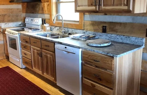 Upon entering through the front door, a large living room welcomes you with comfy furniture gathered around the stone fireplace with gas logs. 43" Roku Smart TV and WiFi (FUBO programming included for sports and local channels) will make couch potatoes and computer geeks contented. Of course, one could always choose to read a book, take a nap, or, if you’re lucky enough to get some rain, go out on the wrap-around porch and listen to the raindrops pelting the cabin’s metal roof. Now, that’s some serious country fun!
