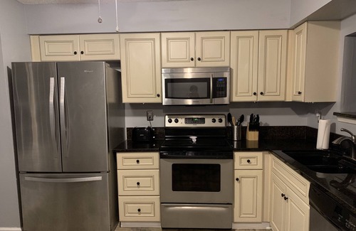 Fully stocked modern kitchen with all the amenities of home. Fully functioning cooktop/oven, microwave, dishwasher, and refrigerator with ice-maker in the bottom freezer.