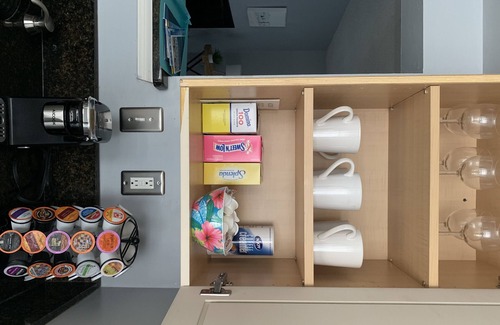 Coffee, Tea and Bar area with a variety of coffee pods, creamer and sugar provided.