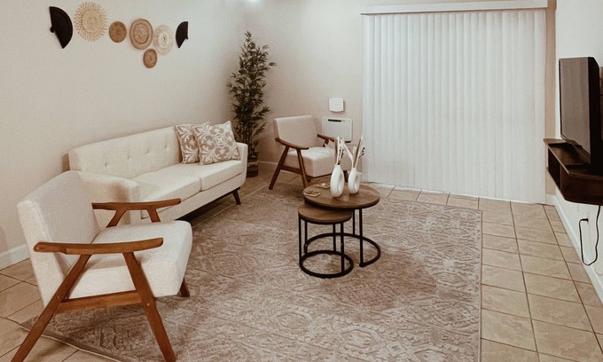 Welcome to our newly renovated, comfortable, and peaceful 2BR apartment! Located in a prime spot, we are within walking distance of UF Shands hospitals, VA hospital, UF Vet School, and the football stadium. Recently updated with a brand-new AC unit and thermostat, fresh paint, wood flooring in the bedroom, and a new ceiling fan, our space is designed for your comfort. Relax in the living room with a Smart TV and Roku, perfect for streaming your favorite shows. The apartment is on the first floor, making it accessible for individuals with mobility concerns.