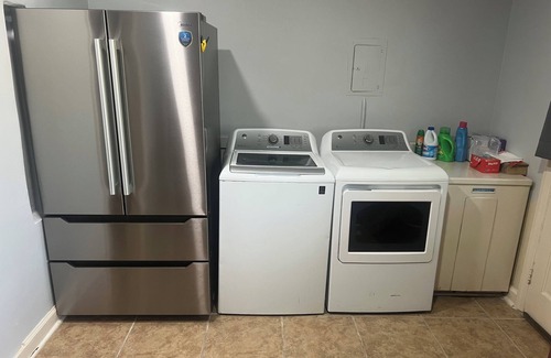 You'll love the convenience of the fully stocked kitchen, complete with a stove, oven, refrigerator, and all the appliances you need to whip up delicious meals. Enjoy your coffee or a refreshing smoothie while relaxing at the dining table. When it's time to refresh, you'll find plush towels, basic toiletries, and a washer and dryer for your convenience.