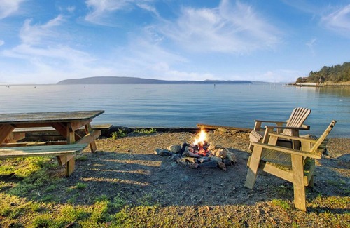 The covered beachfront patio includes a table, chairs, charcoal BBQ and utensils, and amazing westerly views and wildlife viewing! Step off the patio and relax next to your private beachside firepit. Two beach chairs, table, and a picnic table with umbrella (seasonal) are also included. Or, hop onto the beach and lift up a few rocks - you might be surprised at what little creatures you'll find!