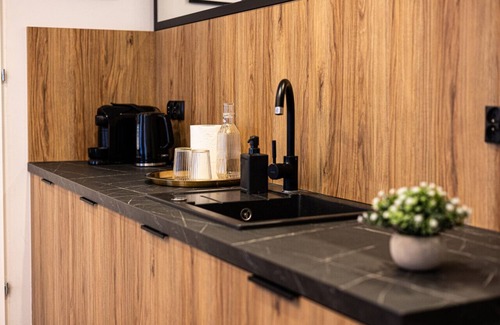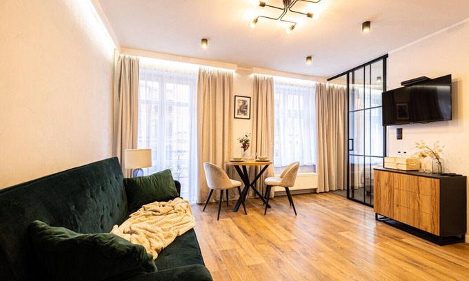Each apartment is designed to meet the expectations of even the most demanding guests. The interiors feature a private bathroom with a shower, a fully equipped kitchenette, and a spacious living area with a comfortable bed, wardrobe, table, TV, and high-speed internet. The modern design blends seamlessly with historic architecture, creating a cozy and stylish atmosphere perfect for both tourists and business travelers.