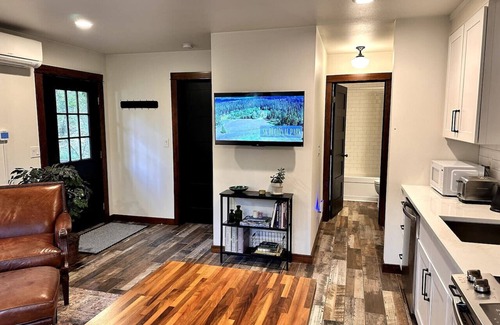 Discover serenity in this beautifully designed upstairs unit, where rustic charm meets modern comfort. Nestled in a lush woodland, this cozy space offers a perfect retreat from daily life. Drift off in a plush bed with organic cotton sheets and and wake up to peaceful forest views.