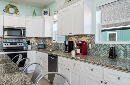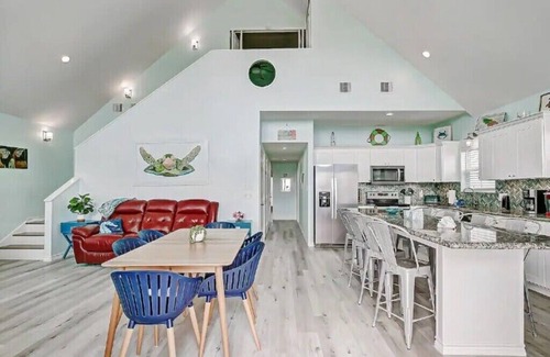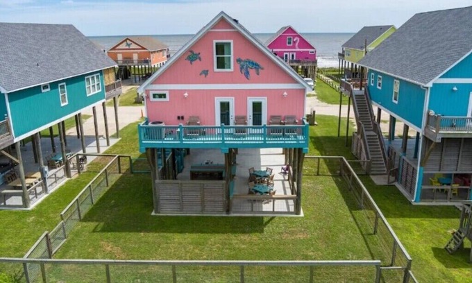 Welcome to Save The Turtles, where beach bliss and vibrant design collide in one unforgettable oceanside retreat. From the moment you arrive, the cheerful pink and turquoise exterior sets the tone for a fun, carefree getaway. This bright and breezy 5-bedroom, 3-bathroom escape is designed to comfortably host extended families or create a cozy retreat for a smaller group. Inside, natural light pours through floor-to-ceiling windows, highlighting the home’s playful palette and airy layout. Whether you're here for a weekend of relaxation or a week of seaside adventure, every detail has been thoughtfully crafted to capture the essence of coastal comfort.