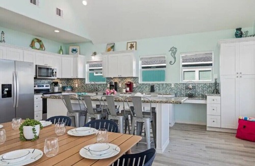 Soft hues with pops of sand and sea, paired with vaulted ceilings, accentuate the expansive living room and create a light, airy space where entertaining feels effortless. Floor-to-ceiling windows, and an open-concept living space invite sunlight to dance across the serene coastal-inspired interiors. Whether you're gathering for meals, playing games, or simply enjoying the views, every inch of this home radiates relaxation and joy. The kitchen is a modern haven, outfitted with stainless steel appliances and stylish finishes. Gather around the oversized island with seating for four or dine together at the spacious table for six. Whether you're prepping snacks for the beach or enjoying a seafood dinner, this space is as functional as it is beautiful. The adjoining living room features cozy sofas and a smart TV, perfect for unwinding after sun-filled days.