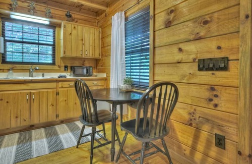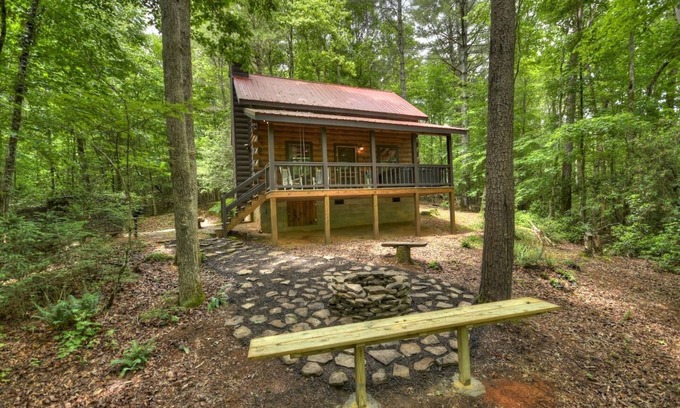 Honeybear Hideaway is a small cabin (600 sq ft) that’s packed full of amenities to help you unwind and enjoy each other's company. You'll experience tranquility right away when you sit in one of the rocking chairs on the front deck and listen to the creek below and the birds chirping in the nearby woods. Enjoy a fire in the custom-built firepit or the romantically lit porch while you unwind. If a night out on the town appeals to you more, head to Ellijay or Downtown Blue Ridge, both of which are located less than 10 miles away.