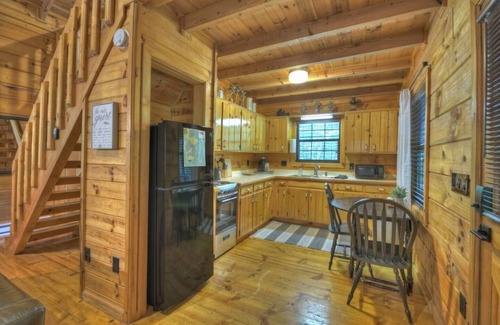 Step inside the cabin to get away from the daily hustle a! Pass the fully equipped kitchen (which includes a Keurig machine). Next, enter the quaint family room with the wood-burning fireplace and the 50" smart TV with cable that is mounted above the fireplace.