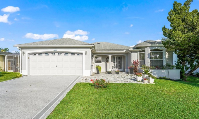 Nestled in the charming Village of Del Mar, this 3-bedroom, 2-bathroom designer home exudes a bright and open floor plan that is perfect for entertaining. The fully equipped kitchen boasts a cozy breakfast table while the dining room can seat up to six guests comfortably. Relax in the two living rooms with ample seating and enjoy your favorite television shows on the flat screen TV, offered in the main living room. The master bedroom features a king size bed and an en-suite bathroom with his and her vanity sinks, separate jacuzzi tub, and walk-in shower - all designed to provide ultimate comfort. The guest bedrooms offer equally comfortable accommodations with a queen size bed in one bedroom and a twin with twin trundle bed in another. Step outside onto the large lanai attached to an inviting birdcage where you can enjoy your morning coffee or evening cocktail surrounded by lush greenery. This stunning property is conveniently located near Chula Vista Executive Golf Course and Mira Mesa Executive Golf Course as well as Rio Grande and Chula Vista Rec Center family pools for endless outdoor fun. Spanish Plaines Shopping Center is just minutes away for all your grocery needs while restaurants, banking, and other amenities are also within easy reach. Experience true Villages living at its finest - only a short distance from Spanish Springs Towne Square and Lake Sumter Landing Market Square were it’s an ideal spot to listen to