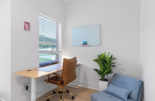 2nd floor: two king bedrooms, two workspaces - one with whiteboard, bluetooth speakers, balcony outdoor dining, string lights, full length mirrors, laundry room, full bathroom, couches that fold out into beds.