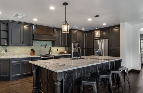 The home has 5 bedrooms, 3.5 bathrooms, and sleeps 10. There is a wood burning fireplace, 2 stackable washer and dryer units in the laundry room, a walk-in pantry, walk in master closet, a great room and front sitting room. The 9' dining table seats 10 and is located off the large open kitchen with a 10' island that accommodates 4 comfortably. With a large, inviting living room with a view of South Mountain, you can lay on the sizable couch to relax and enjoy!