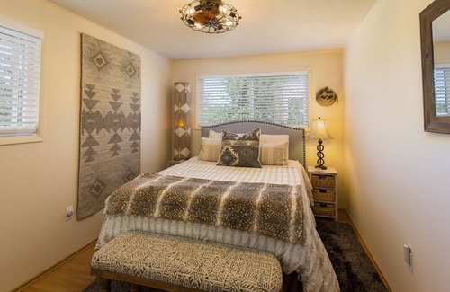 The 3 apartments each have a separate and unique entrance. “Wild Rose” is the largest apartment. Just 2 bedrooms, but there's also an office, a TV room and a proper living room. There's casual dining in the large kitchen, PLUS there is a formal dining room. The patio is private, with plenty of seating. Wild Rose is a newly remodeled apartment with style and comfort in mind. It has a well-equipped kitchen for all your cooking needs and air conditioning to help in the rare warmish days of summer.