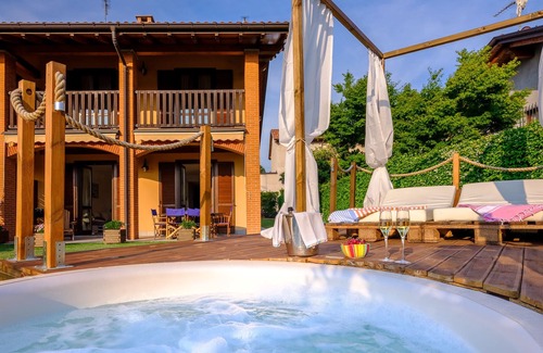 A beautiful wooden deck with sun loungers and a fantastic Jacuzzi in the garden, makes it for great sunsets overlooking the lake, while sipping a beer, a glass of fine wine and Italian aperitifs together with your spouse, family or friends.