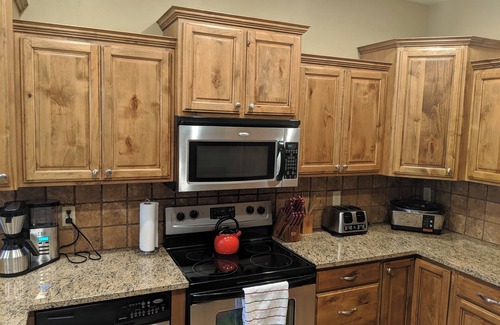 The Driggs Digs Condo: Comes with a fully complete kitchen, range/oven, ice maker refrigerator, dishwasher and other small appliances. Items included in the kitchen, coffee, hot chocolate, salt & pepper, sugar, Splenda, napkins, paper towels, service for eight, (Dishes, cups, saucers, knives & forks etc., cooking utensils, bowls, pans, skillets with lids.) Also included is wireless, three flat screen TV’s with Netflix and Hulu live TV, small library of books, magazines and movies. In addition, it has three bedrooms, two baths with double sinks and a deck with a propane barbeque grill. An electronic lock and a doorbell camera have been added for security and ease of access.