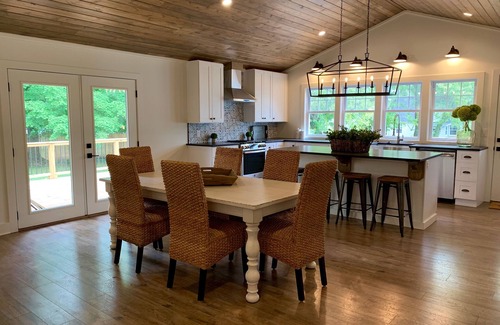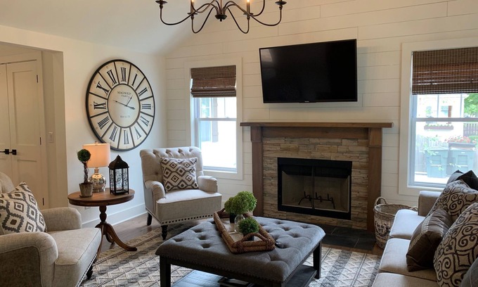 Situated on one of the largest private park-like settings in the village and just a stone's throw from Journeyman Distillery, this 1880’s cottage has been beautifully refurbished by Revive Home Restoration. The home offers refined rustic furnishings, high end finishes/appliances and original architectural details in keeping with the Revive Home Restoration aesthetic. Cook, converse and relax with friends in the gourmet kitchen that features honed granite countertops, a farmhouse sink and beautiful vaulted beamed ceilings. Relax and unwind in the vaulted LR with a wood burning fireplace, large screen TV. Enjoy the master vaulted bedroom with ensuite bath, with walk-in rainfall shower. The open floor plan, including 750 square feet of wrap around decks, a vintage covered front porch, and a large fire pit, are the perfect backdrops for gathering, inside and out. Union House is located just 1 block from downtown shops and restaurants in historic Three Oaks, and offers the very best in ‘weekend’ living, wedding destination stays and moments spent with those that matter most.
