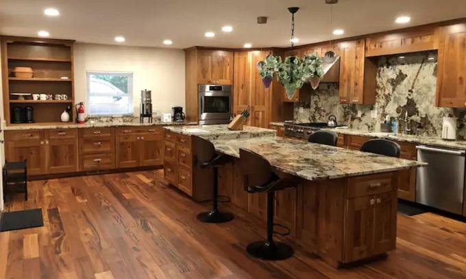 A fully equipped kitchen, luxurious granite countertops, and knotty cherry custom cabinets. Fiber optic WiFi service, flat screen TV and central air-conditioning. Washer/dryer along with a water softening system.
