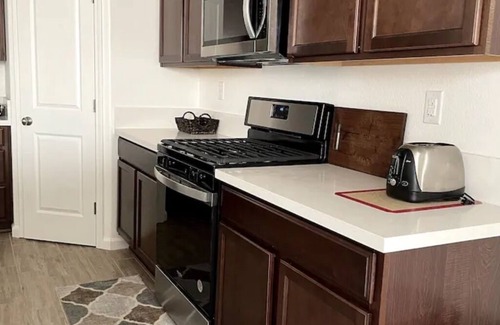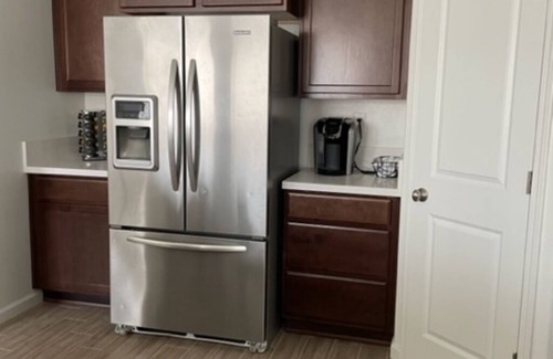 The kitchen is equipped with all the essential tools to cook a full meal and includes a Keurig, coffee pot, and air fryer.
