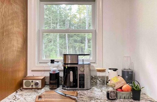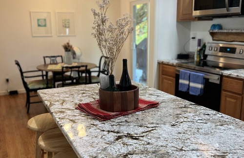 Large Kitchen with island and bar stools. Fully equipped with cooking basics. Breakfast counter with toaster, Keurig coffee maker, pour over machine.