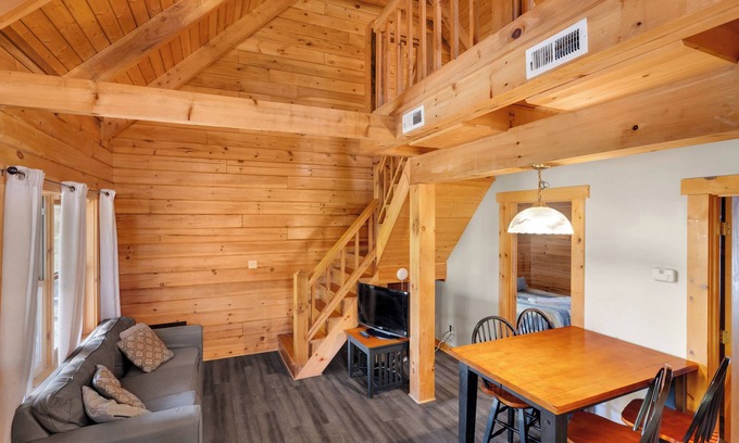 The Log Cabin accommodates up to 8 guests with 2 private bedrooms on the bottom floor, a lofted area with two full-sized beds, living room space, and a fully equipped kitchen for added convenience during the stay. It offers an inviting atmosphere for a group vacation or family getaway. There is a pool located at the property with a boat launch you are welcome to use!