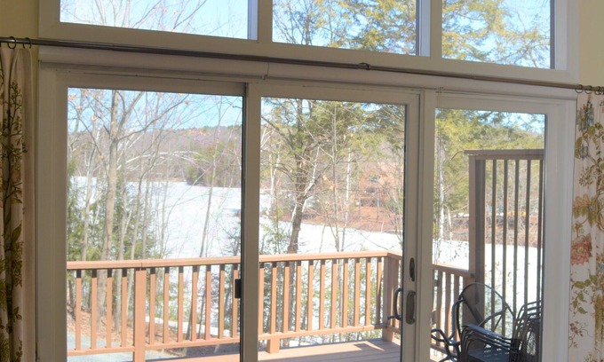 This beautifully furnished condo for rent in Eastman NH is conveniently located in South Shore close to the South Cove Activity Center and South Cove beach. Light and bright condominium with 3 bedrooms, 3 bathrooms that sleeps up to 6 people. Enjoy a private deck on the main level with gorgeous views of Eastman Lake as well as cathedral ceilings in the living room featuring a cozy gas fireplace. The upper level holds a master bedroom with a king size bed, full bath and a loft office area. On the main level is a second bedroom with queen bed and three quarter bath that can be accessed from the bedroom or through the hallway for guests. In the lower level you will find a family room with gas fireplace and slider to a covered porch space and path that leads down to the walking path around Eastman Lake. There is also a third bedroom on this level with twin size bunk bed and full bathroom.