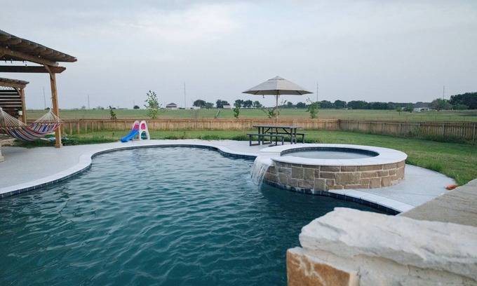 Nestled in the heart of the countryside, just 25 min from Baylor and 20 min to Waco. This family-friendly retreat offers all the comforts of home, with plenty of room to relax, unwind, and create unforgettable memories. Enjoy the added luxury of a beautiful pool area, complete with a hot tub and waterfall feature.