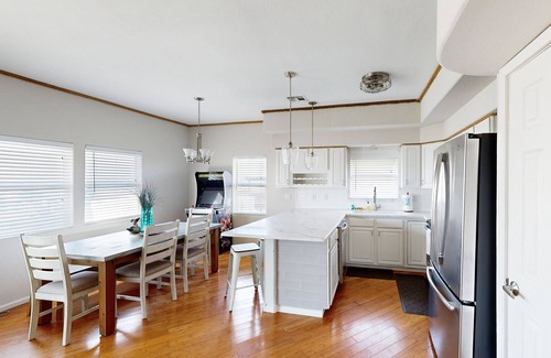 After a day of fun in the sun, unwind in the comfortable living room, stream your favorite show on the TV or challenge your family to a friendly game night with the board, and arcade games provided. The house also offers a dining area, perfect for enjoying meals together with a view of the ocean.