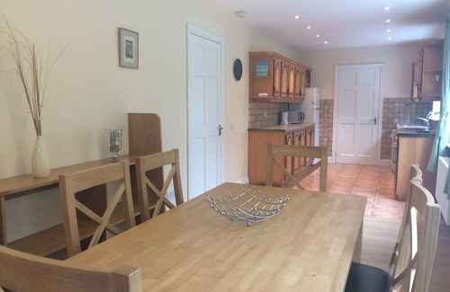 Falls View is located in Ashgrove, just a 2 minute drive from Sheen Falls Lodge Estate in Kenmare. This is a detached house with three bedrooms. Downstairs is a kitchen with a dining area. It is very well equipped and stocked with all the crockery, cutlery, glassware and utensils you will need. It has a utility room with a washing machine and a tumble dryer. The kitchen is fitted with a dishwasher, microwave, kettle, toaster and new fridge freezer. The dining table which is set alongside the window is perfect for your sit-down meals.
