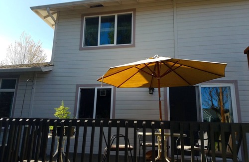This fully furnished 3 bedroom home has the benefits of a great location: 20 minute walk to downtown, 5 minute walk to the Farmers Market, SOU, science museum, several parks and more. And it's in a quiet, picturesque neighborhood. Central air and 2 air filters provide comfort in the summer. You will have full privacy with no one else living on the property. There is a master bedroom with a king bed and private bath, and two bedrooms, each with a queen that share a separate full bath. The first floor's open design with a large living room that flows into the kitchen makes for a very livable space. The kitchen is spacious with a large island for easy cooking. Kitchen table and table on the deck are immediately next to the kitchen for ease. Best of all, there's a hot tub right off the deck. This is a warm, welcoming home ready for you to move into for a month.