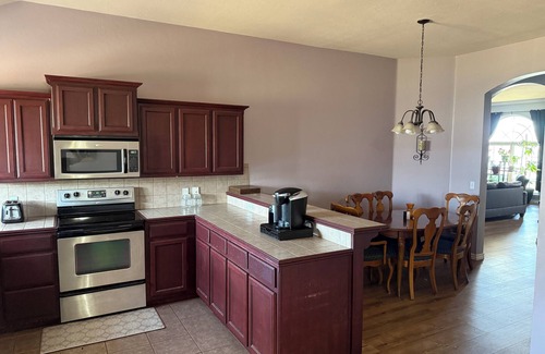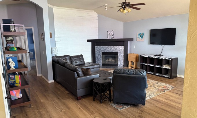 This 3-bedroom house in Norman is perfect for your escape. With a king bed, full bed, and two twin beds, it's a great space for families and groups alike. Two living rooms allow for plenty of relaxing space and a firepit and BBQ grill for beautiful Oklahoma evenings. The two bathrooms are equipped with a shower, bathtub, and hair dryer. Stay cool with AC and heating, and stay connected with WiFi. This fully stocked home will make your stay in Norman the absolute best! We're happy to assist with any questions while you stay at our house.