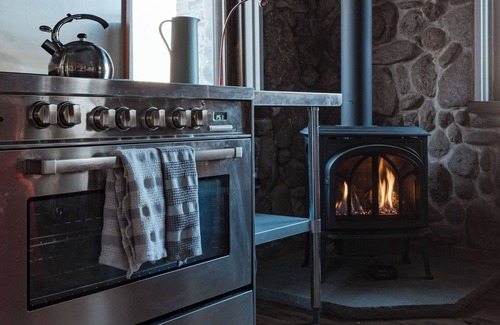Originally built in the 1920’s, the interior has been completely renovated to include two bedrooms with king-sized beds, and a third bedroom with two twin beds (that may be combined to form an additional king) — each with an ensuite bathroom. There is also a half bath, and a living room with a wood-burning stone fireplace, large smart TV and leather sofas, including a queen sleeper sofa. The stainless steel kitchen with original stone walls features a center island with stools for guests to gather, and a gas heating stove that creates a cozy atmosphere. The oversized windows in the dining space bring in a bright, natural light while offering scenic views — the perfect place for making memories with family and friends.