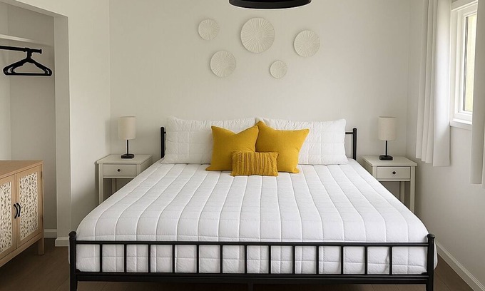 King-sized bed, luxury linens, a 36" smart TV, small vanity, and spacious closet, small dresser with hangers. Multiple USB ports and outlets and the bedside keep all your devices charged.