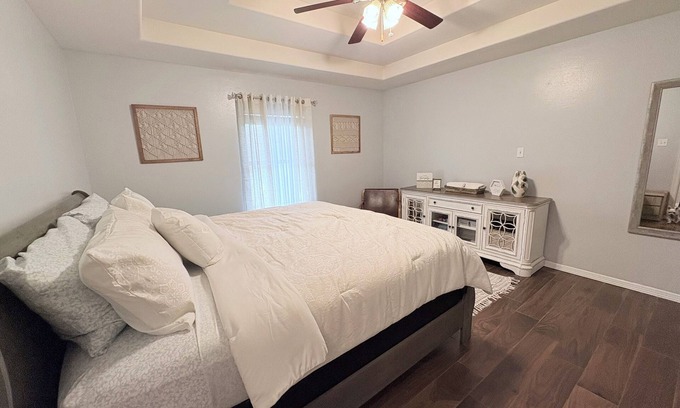 Welcome to this brilliant house in Weslaco. This peaceful retreat offers 3 cozy bedrooms with a king, queen, and full bed and an optional queen size blow up mattress, ensuring a pleasant night's sleep for all guests. With modern amenities like AC, heating, WiFi, and a washing machine, your stay will be comfortable and convenient. It's easy to see why you'll be able to unwind at our place.