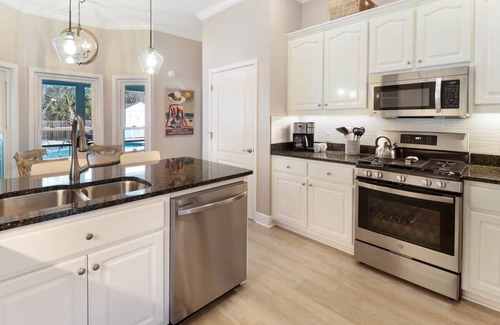 Nautilus Escape is a stylish and comfy stucco paradise just 3 blocks from the beach, featuring a private, heated pool and 6-seater golf cart for easy access. Nestled in a tranquil neighborhood, this airy retreat boasts a spacious open floor plan, large windows, and abundant natural light. The gourmet kitchen is equipped with granite countertops and stainless steel appliances. Outside, the fully fenced backyard offers total serenity, backing up to peaceful woods—your perfect escape!
