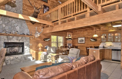 Welcome to Bear Falls Lodge! Come enjoy this beautiful 3- bedroom, 2 1/2 bath log cabin complete with a spacious loft bedroom and separate game room that sleeps up to eight and includes Wifi. Situated above a creek featuring both mountain and waterfall views. Perfect for a family, multi family, group or romantic getaway.