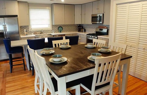 Step right off Asbury Avenue, head up one flight of stairs and enter into this awesome downtown loft. There’s a large open kitchen/living room/great room with sliding glass door leading out to a massive private deck. The gourmet kitchen is made for entertaining and can seat guests comfortably. It’s stocked with cookware, silverware, glasses, paper towels and dish soap. There’s a coffee maker, microwave, refrigerator, stove top, and oven. Enjoy the 50" Smart TV after a long beach day and Boardwalk night.