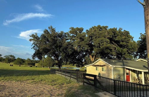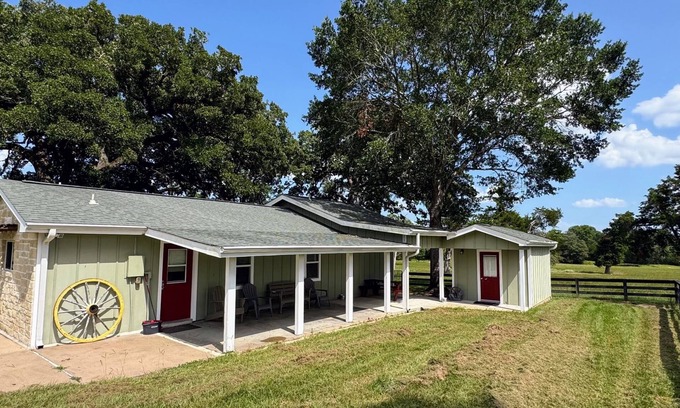 This farmhouse boasts a serene atmosphere, perfect for a relaxing getaway. The property features a large oak tree, fenced-in grounds overlooking pond, Full kitchen with a refrigerator. The front and back areas are ideal for entertaining, This 3-bedroom, 2-bathroom home is well-suited for families, friends, or groups looking to unwind after exploring local attractions. The bedrooms and bathrooms provide a tranquil retreat, with the main bedroom featuring a king bed, TV, and en-suite bathroom. The property is located in a quiet neighborhood in the hills of Burton, Texas, only 15 minutes from Round Top and Brenham making it perfect for peaceful retreats, family gatherings, and outdoor enthusiasts.
