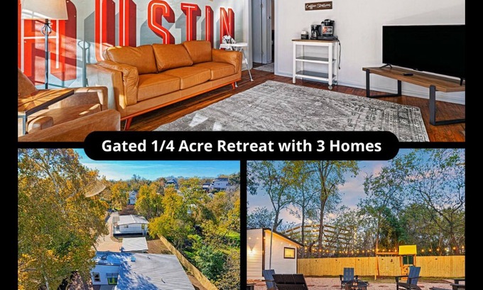 This stunning retreat features three separate beautifully designed homes: the Front Home, the Middle Home, and Tiny Home. Each space offers a harmonious blend of style, comfort, and convenience. With enough space to comfortably accommodate up to 16 guests, this gated property is ideal for large families, group vacations, and special celebrations.