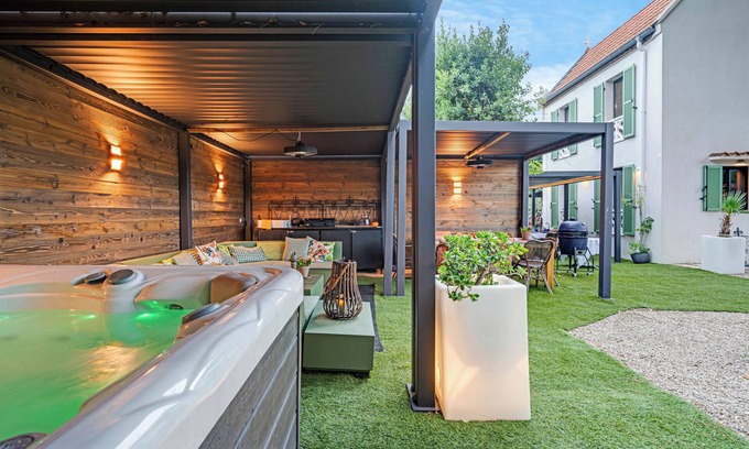 The heated saltwater pool with a shallow platform, jacuzzi, pétanque court, swings, hammocks, trampoline, and shaded lounges turn outdoor living into pure enjoyment.