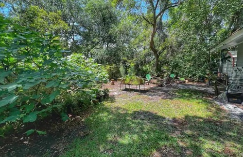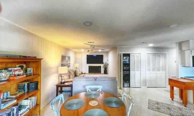 3 minute walk to the beach. Spanish moss covered oaks in the yard. Fenced in back yard. Pet friendly. Mid century modern designed. Our Cottage is a short 3 minute walk to the beach. You can hear the ocean from the oak covered yard with a relaxing backyard with a cooling misting fan to chill out in the evening. We have Comcast 1 gig speed internet with great coverage throughout the house. There are bikes to ride as well as pool privileges at a hotel with 2 pools on the beach. We look forward to hosting you. If you would like even more space, we have an attached Garottage for you to rent if extra privacy is needed. Queen bed kitchen, bath, & W&D. Fenced in back yard