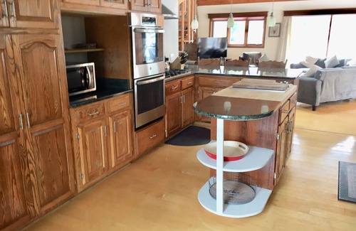 The open floor plan includes a large dining room, great room, loft and a grand kitchen. This space allows for large groups to congregate with viewing access to all three areas. The spiral staircase up to the loft is great to hang out in the futons and enjoy the mountain view through the two skylights. The wood burning stove is wonderful to enjoy and visible from the kitchen, eating area, loft and main great room.