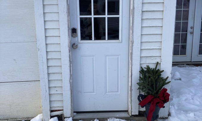 Private entrance to apartment with parking in driveway directly next to apartment door.