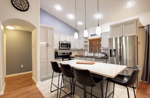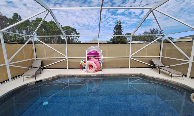 This stunning 3-bed 2-bath home features a heated saltwater pool with privacy screens, a poolside TV, and outdoor dining furnitureβperfect for relaxation and meals. Complimentary soaps, shampoo, and coffee/cocoa bar provided! The Primary Suite offers a king bed, private pool access, shower, walk-in closet, and an office desk. The living room and bedrooms have Smart TVs. The well stocked kitchen is a chef's dream. With a queen bedroom and a twin bedroom, thereβs plenty of privacy for everyone! Minutes to Beaches!
