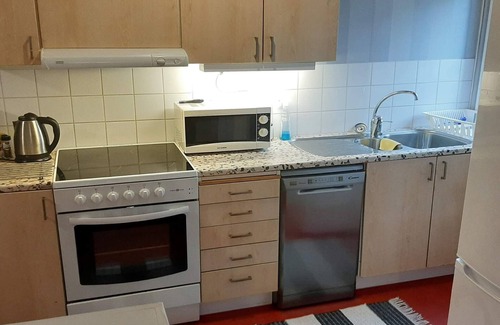 Layout: Kitchen(cooker(electric), coffee machine, microwave, dishwasher, fridge-freezer), Living/bed room(single bed, TV(swedish TV channels)), bedroom(2x single bed), bathroom(washbasin, shower, toilet), washing machine(shared with other guests), heating(central)