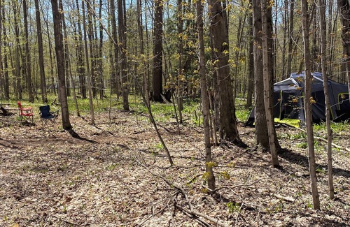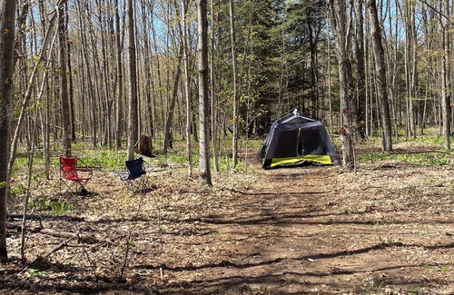 Primitive wooded campsite in a Maple-Beach forest. One of four campsites available on this property. They are all about 150 feet from each other. These campsites are about 1/4 of a mile down on a wooded trail on my 20 acres of land. The campsite has its own campfire pit, flat spot for a tent (tent not included) and places to park. Smaller RV's or Popup campers will fit well in this site. Fresh drinking water are available at the beginning of the trail. The port a poty is shared with the other four campsites. There are wooded trails on the property as well.