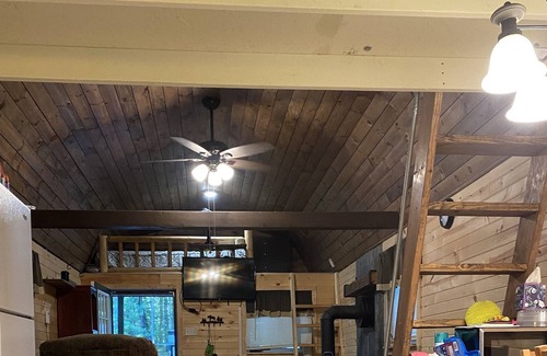 Cabins sleep 13. The Main cabin has 2 lofts, one with a king bed and the second with a queen bed. The living room also has a full size pull out sofa. Full bath with a stand up shower. There is a full kitchen with the exception of a stove. The main cabin’s water is well water. Cabin 2 has a king bed with twin trundle beds. Cabin 3 has a queen bed with a twin size futon couch. There is a tv and dvd player in each of the cabins. Additional amenities included: second toilet is an outhouse for an off the grid vibe, propane grill, propane wall heater in main cabin, space heaters for cabins 2 and 3, fans in all cabins, coffee makers in all cabins, kitchen utensils, and toilet paper.