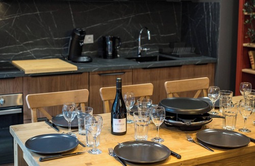 The living room includes a comfortable queen-size sofa bed (160 x 200 cm), ideal for relaxing after a day of skiing or cycling. The open-plan kitchen is fully equipped: fridge, oven, microwave, dishwasher, filter and pod coffee makers, raclette grill, kettle, toaster... A Smart TV lets you unwind, stay informed, or stream your favorite content. A small balcony completes the space.