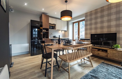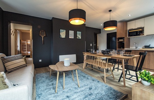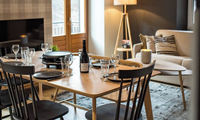The living area features a comfortable queen-size sofa bed (160 x 200 cm), perfect for relaxing after skiing or a day out cycling. The open kitchen includes everything you need: fridge, oven, microwave, dishwasher, filter and pod coffee machines, raclette grill, kettle, toaster… A Smart TV lets you relax, watch the news, or stream your favorite shows. You’ll also enjoy a small balcony.