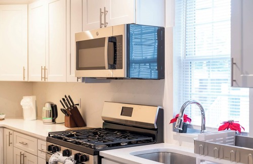 The kitchen is fully equipped with modern appliances, including a refrigerator, stove, oven, microwave, and coffee maker. Basic cookware and dishes are also provided for your convenience.